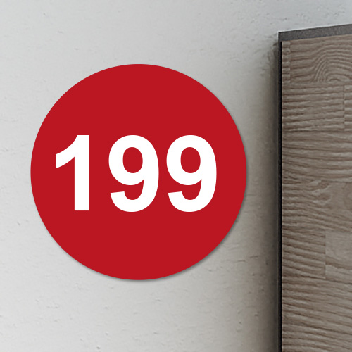 Een huisnummerbordje rond in rode kleur met een doorsnede van 15 cm.