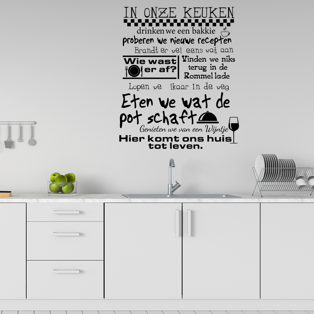 Pakkende Keukensticker voor op de keukenmuur met unieke teksten "In onze keuken....". Fleur de muur op met deze makkelijk te bevestigen muursticker. Wordt geleverd binnen 1 werkdag en vakkundig voor u geproduceerd. Dit is een must-have voor iedere liefhebber van decoratie op de muur.