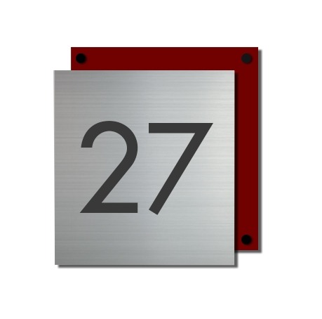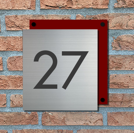 Luxe naambord bestaande uit een rode kunststof achterplaat waarop een geslepen RVS-look plaat is gemonteerd. Formaat 15x15 cm