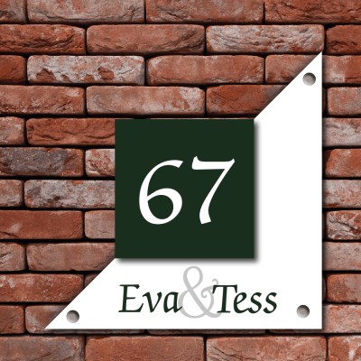 Kunststof naambordjes in de lijn van Gracieux-Line in de naambordjes kleur wit en de achtergrond van het huisnummer is groen.